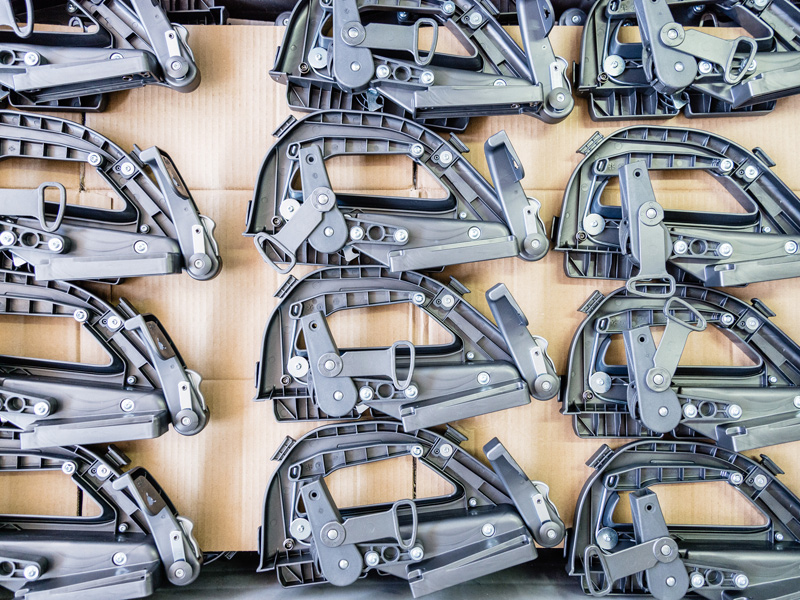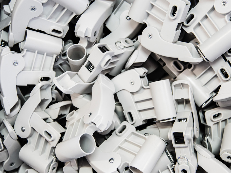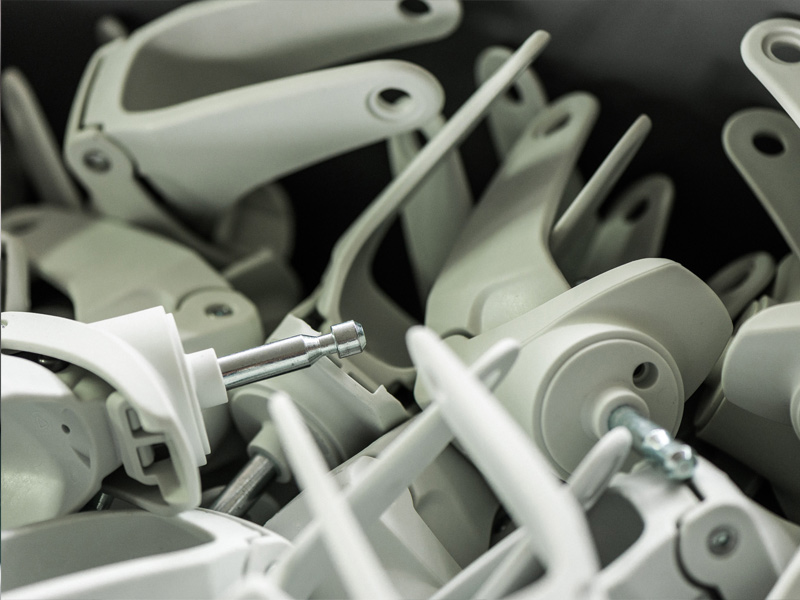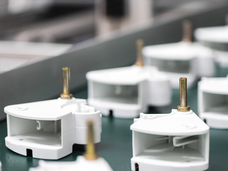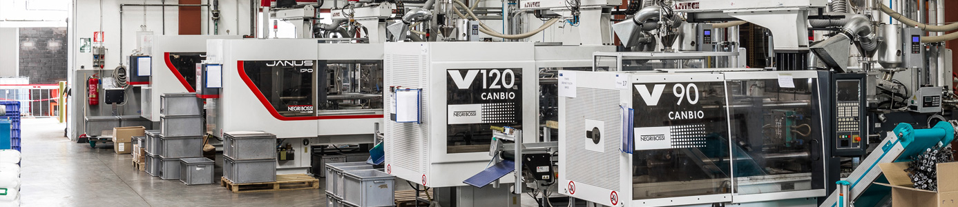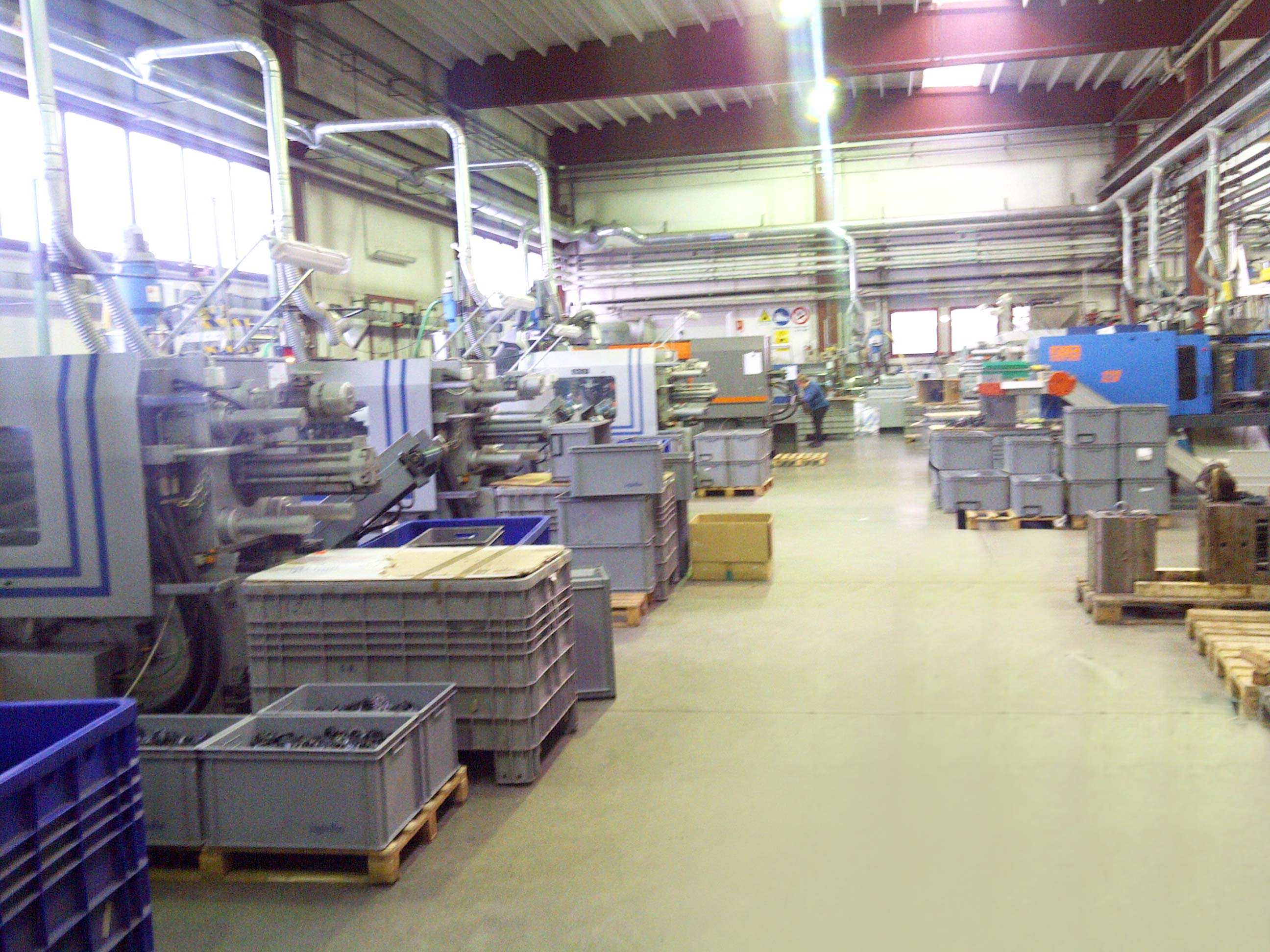 Il reparto di stampaggio usa 16 presse ad iniezione collegato ad un recente impianto di essiccazione, deumidificazione e distribuzione delle materie prime lavorate. Dotate di robot e manipolatori e distribuite su un’area di circa 1000 mq hanno un tonnellaggio che varia dalle da 70 ton alle 250 ton. Vengono trasformati svariati tipi di materia prima, dal polipropilene alla poliammide 6, 6.6 con diversi tipi di carica, resina acetalica e gomme di diversa durezza. E’ presente anche un impianto di condizionamento della poliammide che permette l’uso del componente stampato in tempi rapidi.